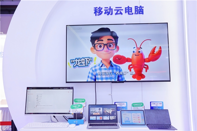 在算力服务展区,移动云电脑依托OpenClaw AI智能体,支持一键部署、云端操控,观众可现场体验"云养龙虾"等趣味互动。在智能服务展区,中尺寸双足机器人与四足机器狗定时开启互动演示,具备迎宾导览、智能问答等功能,并进行热舞及"后空翻"等演示表演,吸引众多观众参与互动。