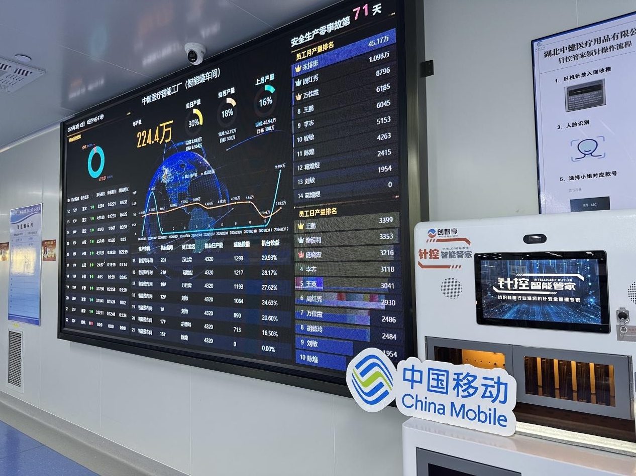 在湖北中健医疗用品有限公司生产车间里,一台台设备高速运转,生产线上的每一个动作都被5G设备里的芯片精准记录,数据实时上传、信息集成,整个车间在一个“数字大脑”的统一指挥下有序生产。