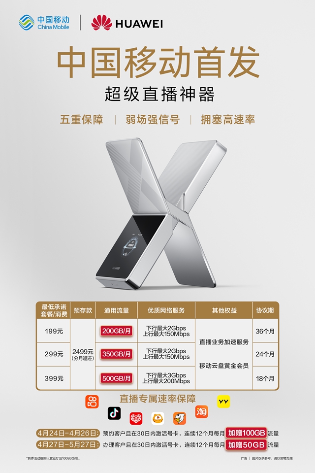 4月24日起,中国移动与华为联合打造的“超级直播神器”开启预售,4月27日正式发售。五一携“超级直播神器”出游,无论去人潮如织的景区、热门音乐现场还是各类大型主题展,都能享受信号满格的VIP直播体验。