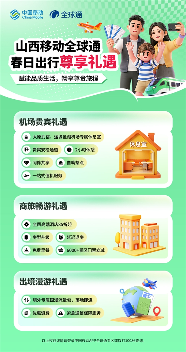 近日,民航迎来2026年夏航季换季,从太原直飞香港、曼谷等境外航线网络的扩容与航班时刻的优化,为春季文旅市场注入强劲活力。作为高品质通信服务的引领者,山西移动全球通紧扣“春日出行”热点,依托“服务、网络、权益、保障、身份”五大尊享体系,全面升级出行礼遇,从机场贵宾服务到全国商旅优惠,从出境漫游保障到家庭共享福利,全方位覆盖用户出行全场景,让每一次出发都成为“尊享之旅”。