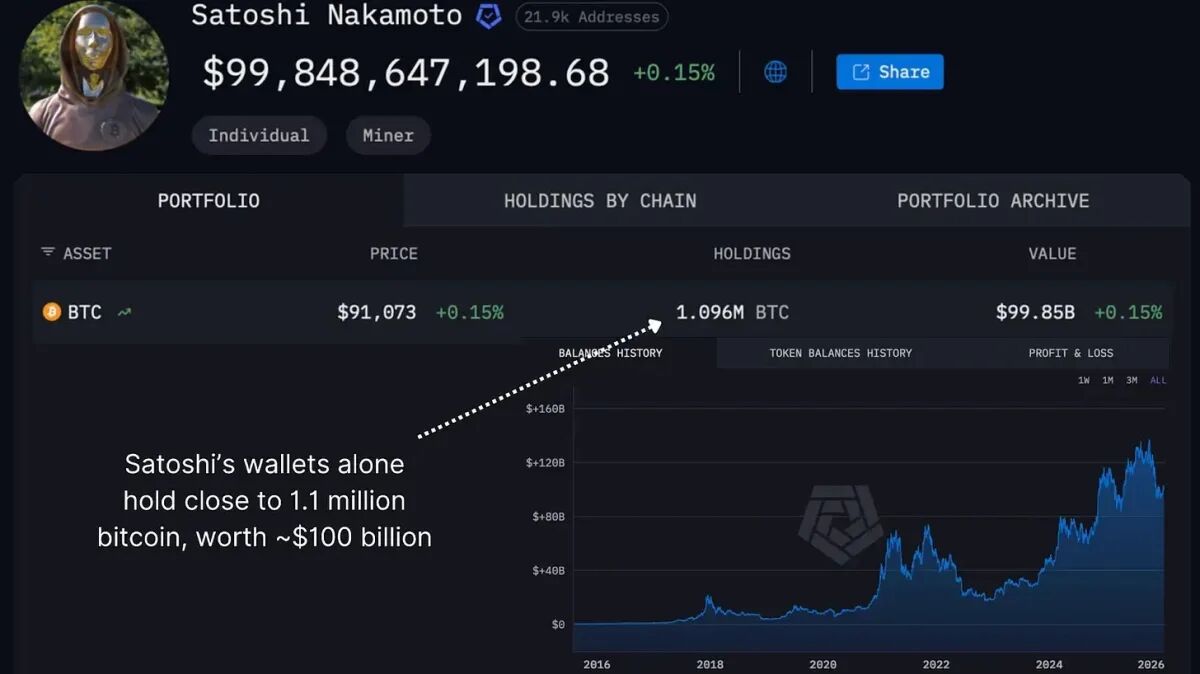 近日有外媒突发奇想,联想到比特币世界最神秘的人物——中本聪。该传说级大神据传账户中拥有110万枚比特币,价值约1000亿美元(近日估值有所下滑),但从未动用过。
