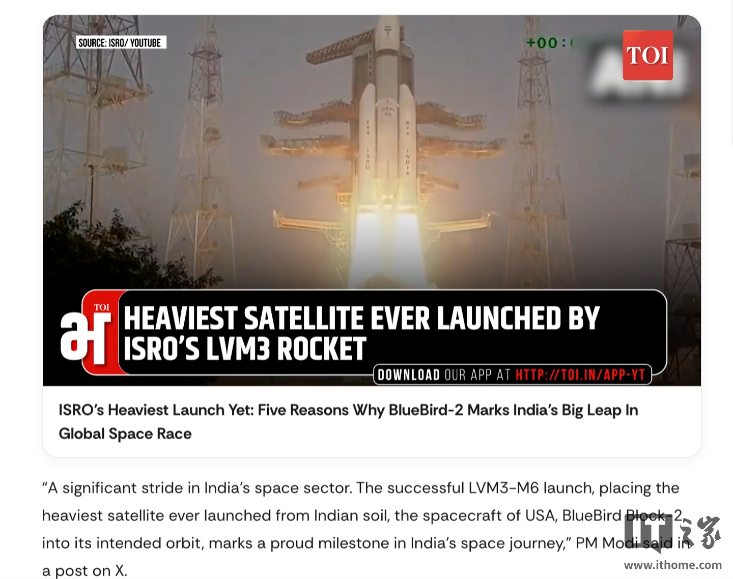 据《印度时报》昨日报道,印度空间研究组织 LVM3-M6“巴胡巴利”火箭成功将一颗重达 6100kg 的美国新一代 BlueBird Block-2 通信卫星送入轨道。