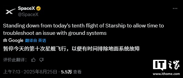 SpaceX 官方刚刚在 X 上宣布,暂停今天的第十次星舰飞行,以便有时间排除地面系统故障。