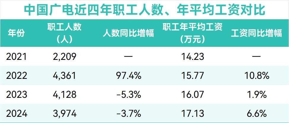 近四年来,中国广电职工平均工资稳步增长。据国家广播电视总局统一披露的直属企业工资信息数据,中国广电的年平均工资从2021年的14.23万元增至2024年的17.13万元,累计涨幅达20.38%。