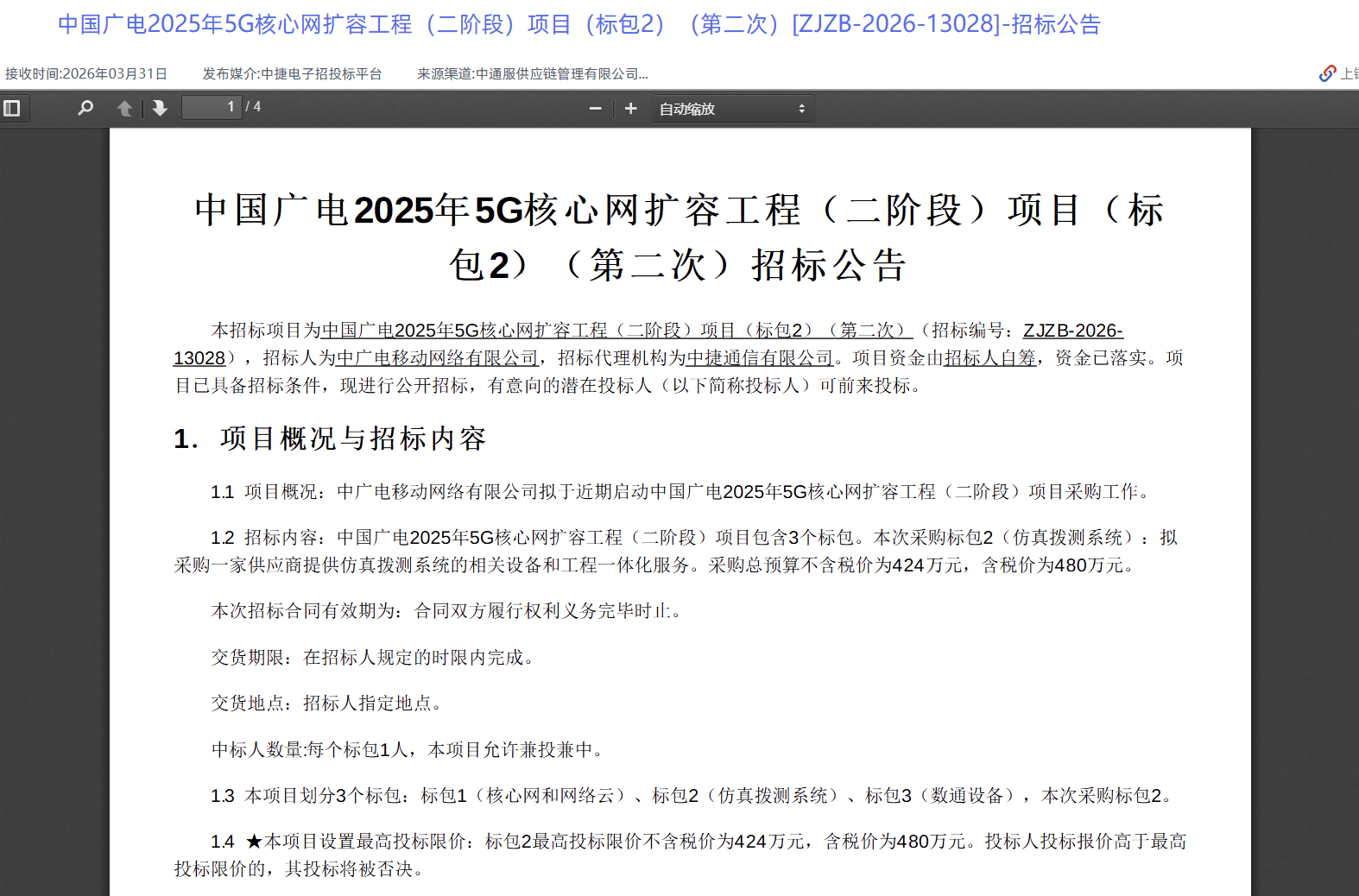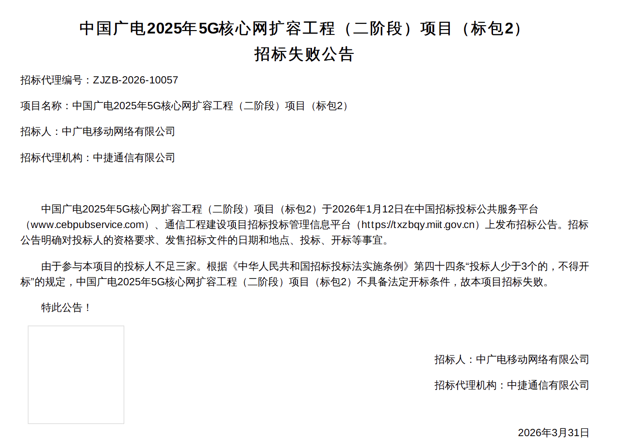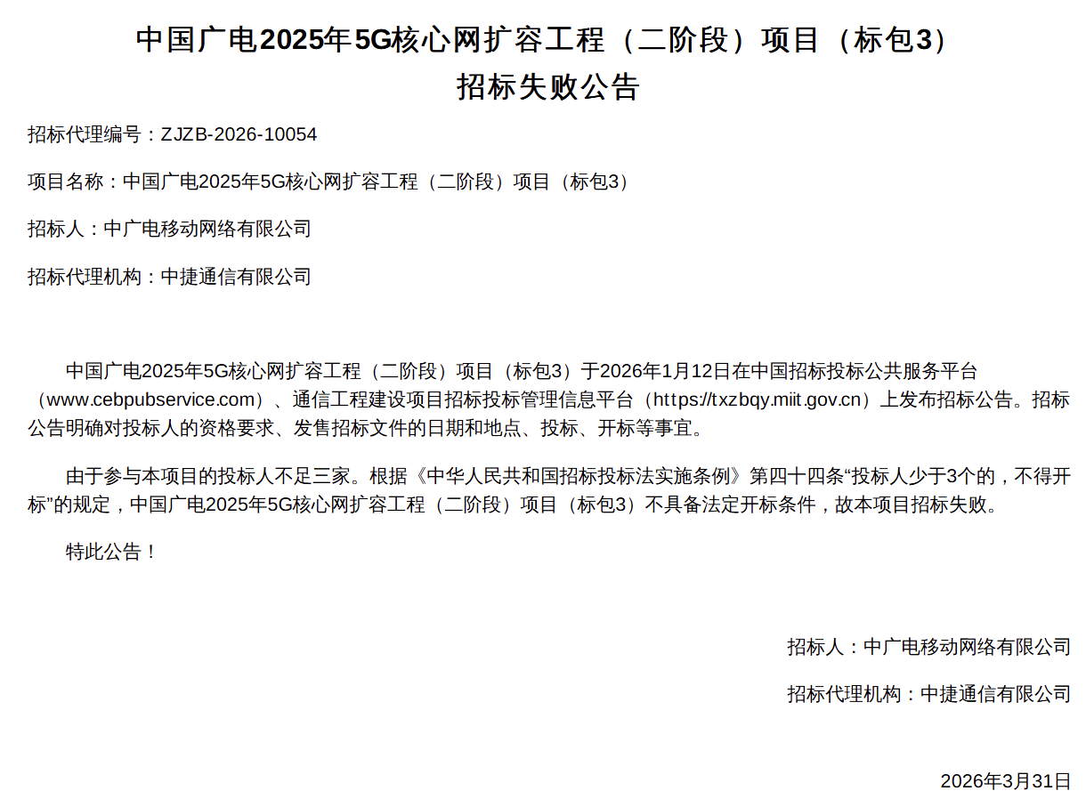 C114讯 4月2日消息(颜翊)3月31日,中广电移动网络有限公司发布公告,宣布中国广电2025年5G核心网扩容工程(二阶段)”标包2和标包3采购失败,原因均为参与项目的投标人不足三家,不具备法定开标条件。