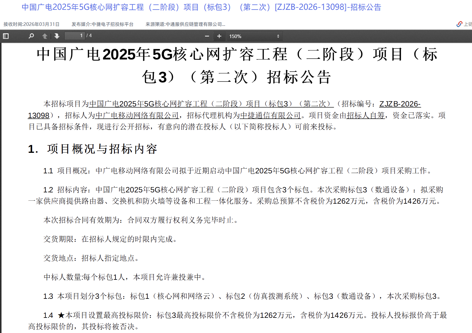 据了解,该项目共划分为三个标包:标包1(核心网和网络云)、标包2(仿真拨测系统)、标包3(数通设备)。