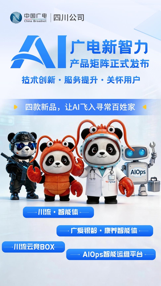2026年4月14日,中国广电四川公司在第十三届中国网络视听大会上正式发布四款自主研发的AI产品——川流·智能体、广爱银龄·康养智能体、川流云竞BOX及AIOps智能运维平台。这是四川广电网络在人工智能领域的系统性战略布局,也是“技术创新 +服务创新”双轮驱动战略的集中落地。