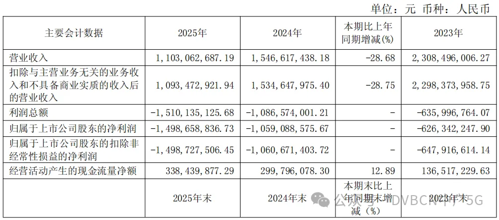 陕西广电网络昨日发布了2025年年度报告。报告期内,公司实现营业收入11.03亿元,较上年下降28.68%;归属于上市公司股东净利润-14.99亿元,亏损较上年扩大41.5%。
