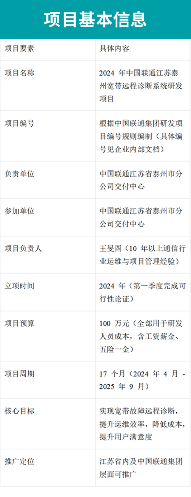 2024 年中国联通江苏泰州宽带远程诊断系统研发项目是泰州联通为响应 “数字中国” 战略、落实中国联通 “强基固本、守正创新、融合开放” 的战略要求,针对区域宽带运维服务痛点启动的重点研发项目。项目的核心信息如下: