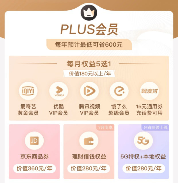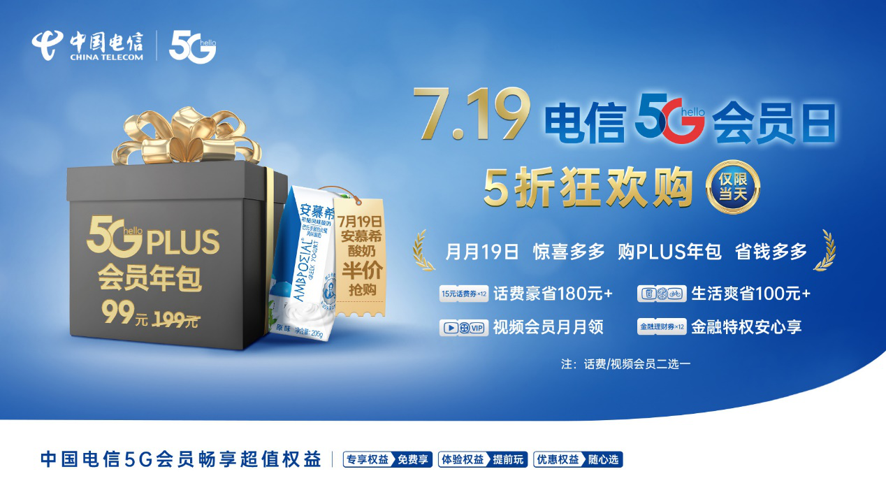 7月19日“电信5G会员日”活动当天,所有中国电信移动用户订购PLUS会员年包即可享受5折(原价199元,限时99元)优惠。