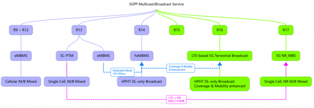 众所周知,3GPP组播广播技术标准也已经演进了很久,在4G时代的Rel-8、9就已开始关注组播广播技术,直到Rel-13阶段显现为向两种路线迈进的趋势:一条为eMBMS,后期还继续衍生到了Rel-14和Rel-16,其一脉相承的仍是基于LTE的广播技术;另一条技术路线5G NR MBMS是直接从R13 SC-PTM(Single Cell Point To Market Point)演进过来的,工作原理都是单小区的对多点组播,只不过SC-PTM也是LTE技术架构,而5G NR MBMS是基于NR。