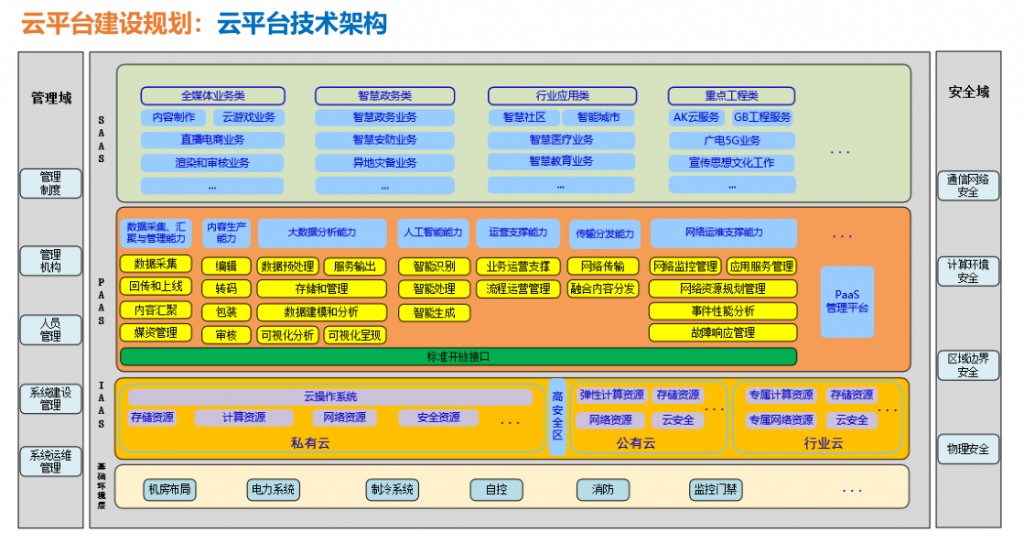 此外,云平台特点之一便是讲究资源的虚拟化和白盒化,之二则是考虑服务的能力化及可自定义化,之三则是以实现业务部署的敏捷化及管理的扁平化。云平台建设中也将注重数据采集、汇聚与管理能力,内容生产能力,网络运维支撑能力,传输分发能力,大数据分析能力,人工智能能力及运营支撑能力。