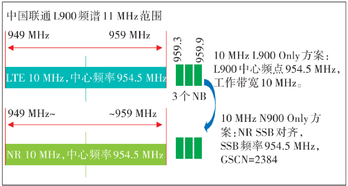 NR900 10 MHz部署模式和现网L900 10 MHz的工作频段保持一致,SSB频点被设置为954.5 MHz,GSCN被设置为2384,此模式在保障NR900同频切换的基础上,可减少现网翻频工作量,NB仍保持在右侧200 kHz。具体如图1所示。