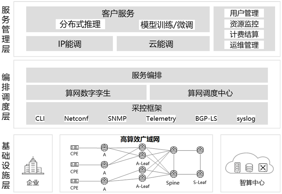 方案围绕底层基础设施、调度与编排层、服务与管理层三个层面设计,系统以服务管理层为入口,客户根据业务需求选择数据迁移、模型训练/微调或分布式训推服务并提交订单。系统生成标准化服务指令,分别调用IP网络与云端智算资源。调度层基于数字孪生实时感知资源状态,匹配最优算力节点与RDMA无损路径,生成配置指令下发至基础设施层。底层400G智算广域网通过NETCONF/YANG协议配置设备,建立高吞吐无损通道;智算中心同步完成算力资源调度与安全配置,联调验证后确保服务满足业务SLA要求。