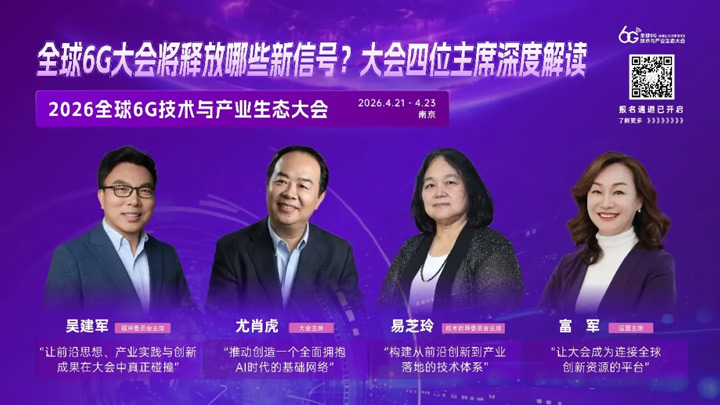 围绕大会主题“极致连接·智能融合·场景共创·产业共赢”,大会主席尤肖虎院士、技术指导委员会主席易芝玲、程序委员会主席吴建军以及运营主席富军,从不同角度解读了2026全球6G技术与产业生态大会的设计思路与核心亮点。